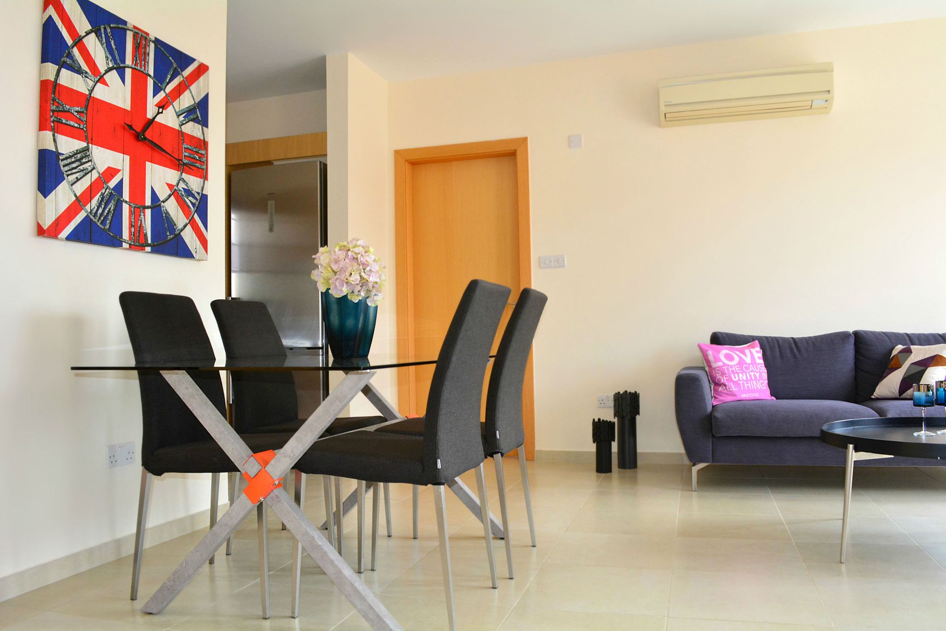 The open-plan lounge and dining area features a comfortable sofa, flat-screen TV, and dining table for six, with French doors opening onto two furnished balconies. The well-equipped kitchen has granite worktops, microwave, washing machine, and all modern conveniences.
