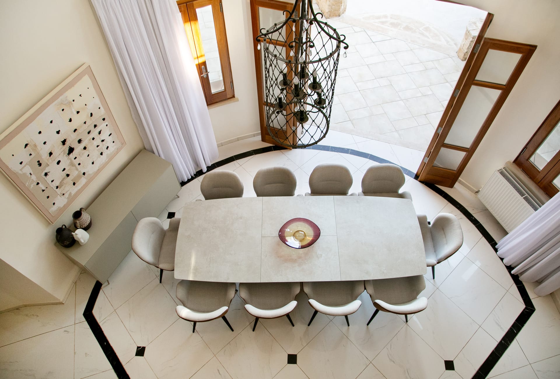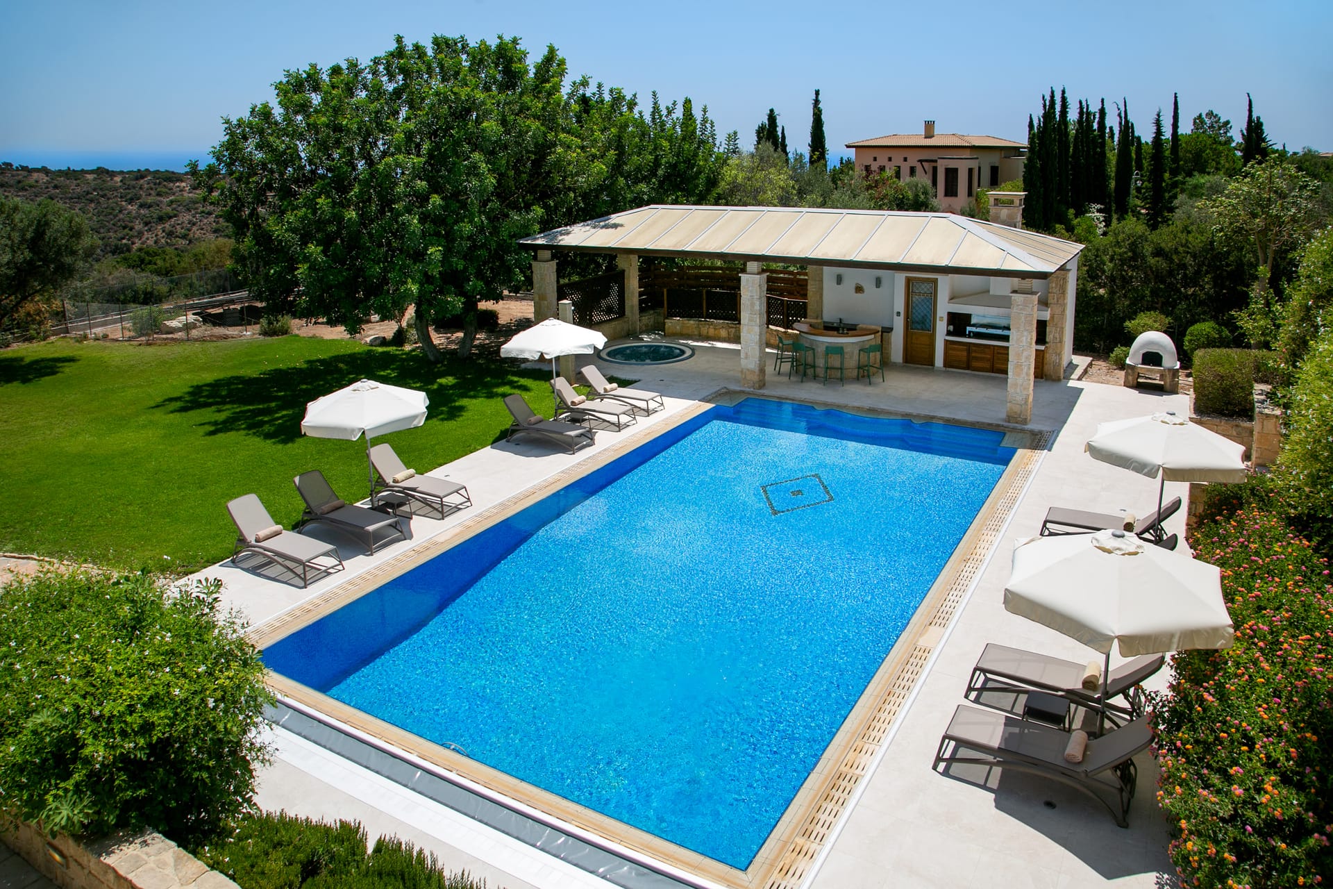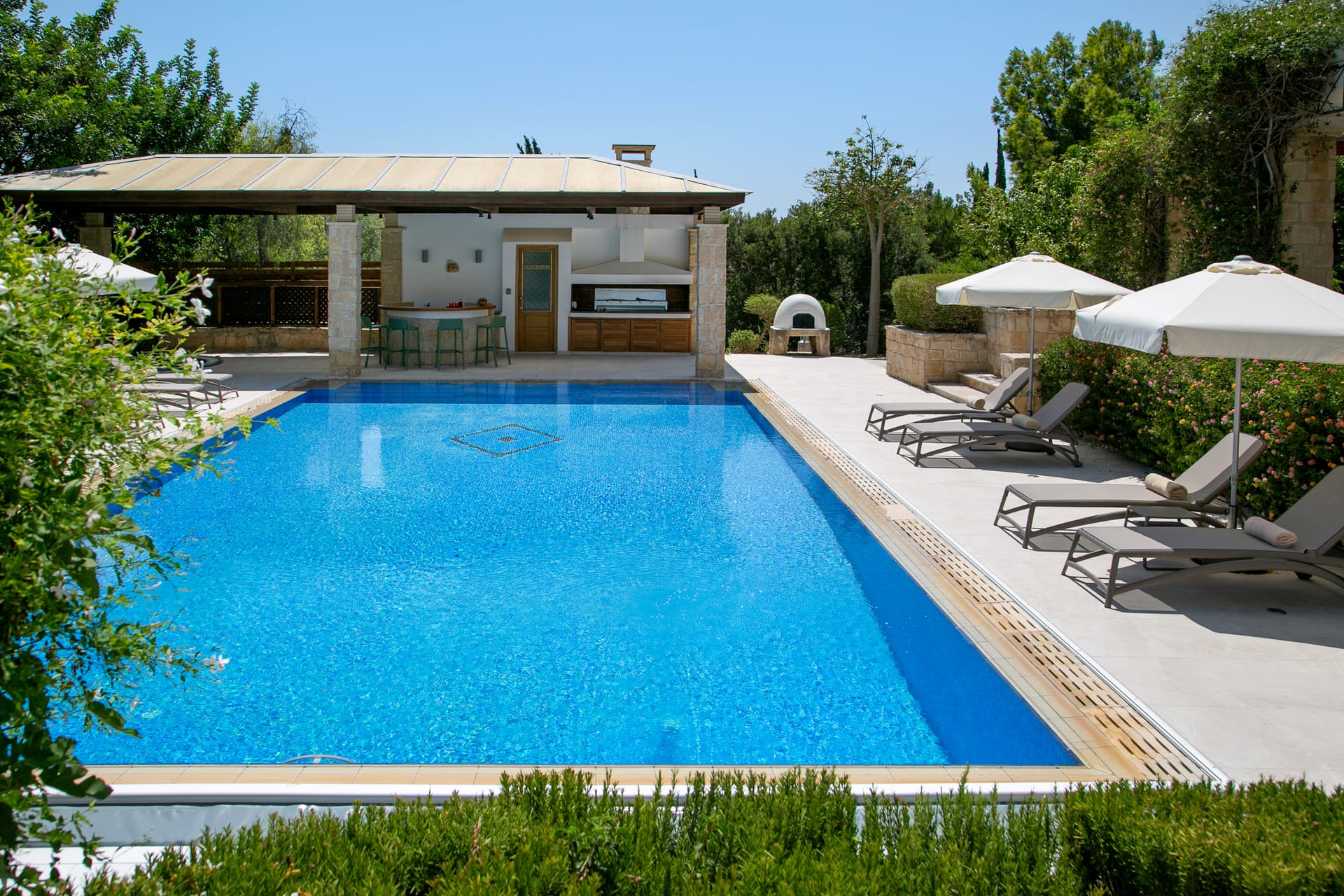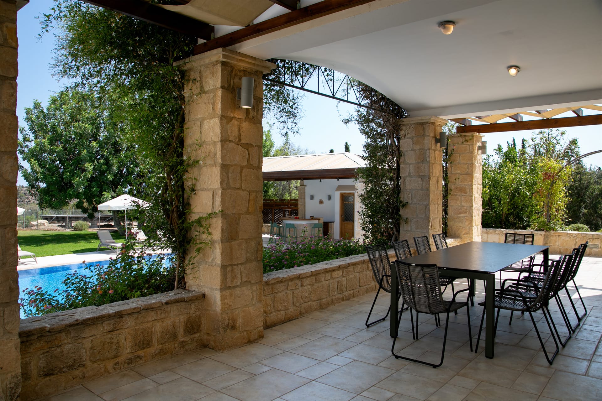 Patio doors open out from the lounge revealing the spectacular 12x5 meter pool. The patio area nests amidst fragrant shrubs, plants, and various kinds of native Cypriot flowers that also surround the large lawn. For all those who prefer to dine outside, have a BBQ or simply enjoy their breakfast by the pool the shaded dining areas together with the bar counter add the final touches to a wonderful outdoor experience.