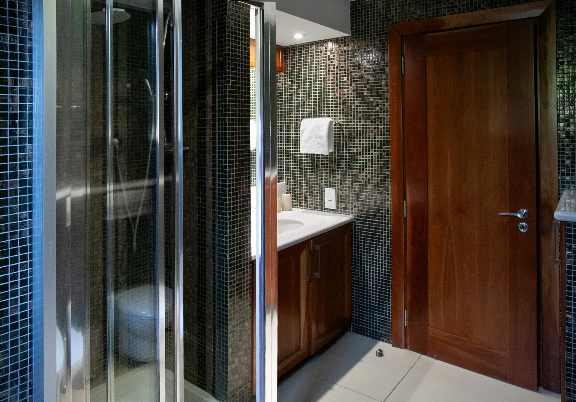 The fifth bedroom is at the lower ground level and has patio doors that lead out to the pool level with a slowly inclining ramp.