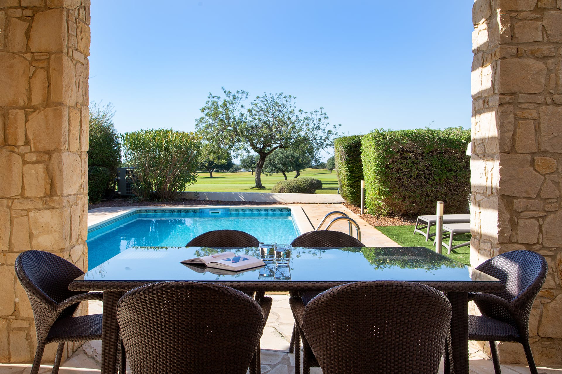 Outside, enjoy the private pool, sun loungers, and dining area,all set against the backdrop of lush golf course views.