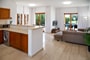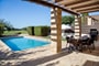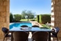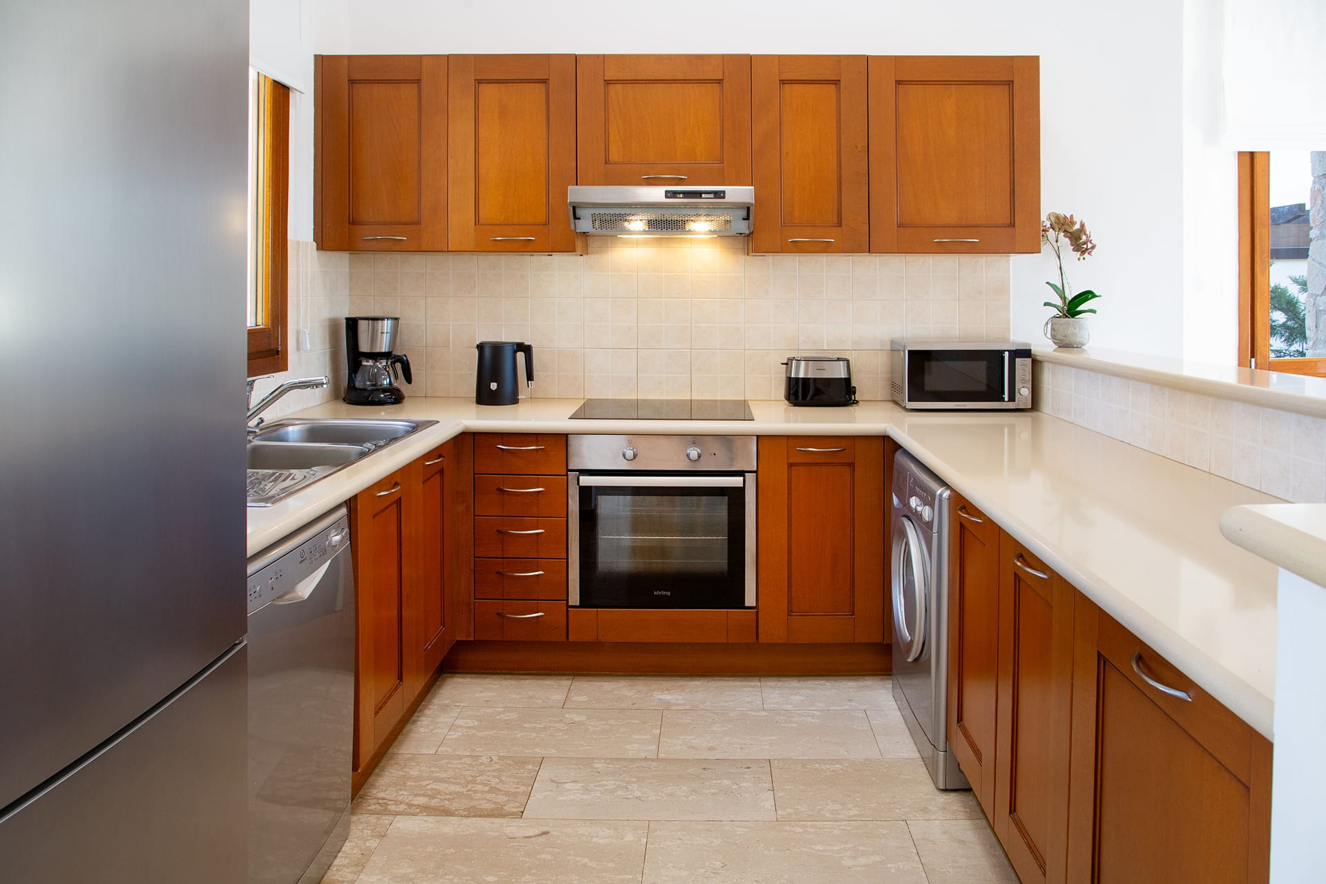 Decorated in neutral tones with modern finishes, the bright living area features fabric sofas, a TV, and French doors opening to the pool. The dining space includes a glass table with four chairs, and the Italian kitchen is fully equipped with granite worktops and stainless steel appliances.
