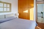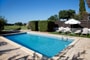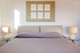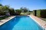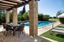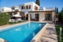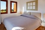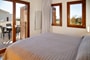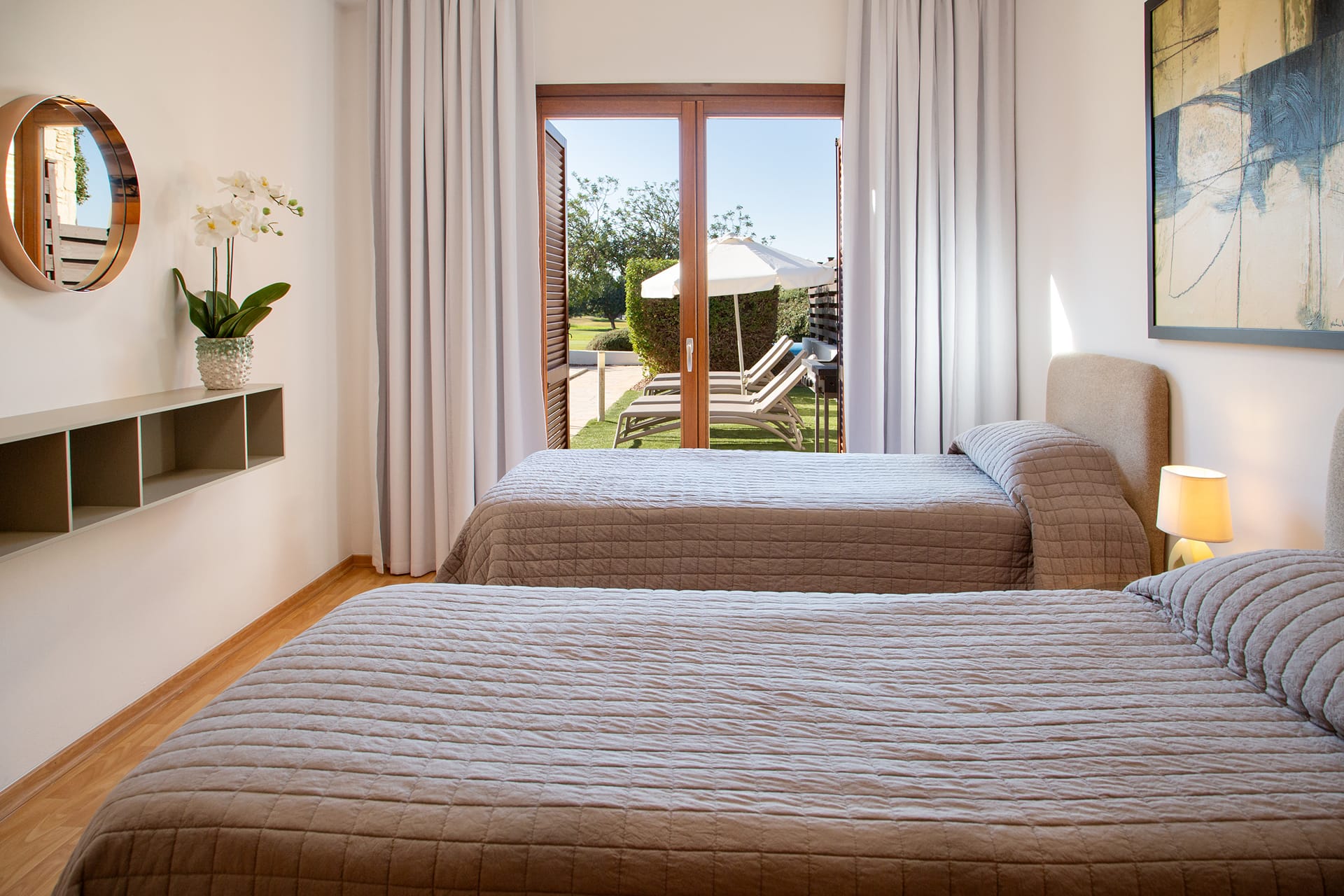 The ground-floor bedroom has twin beds (convertible to a double) with direct pool access and a nearby shower room. Upstairs, the master bedroom also has convertible twin beds, a private balcony, and an adjacent bathroom.
